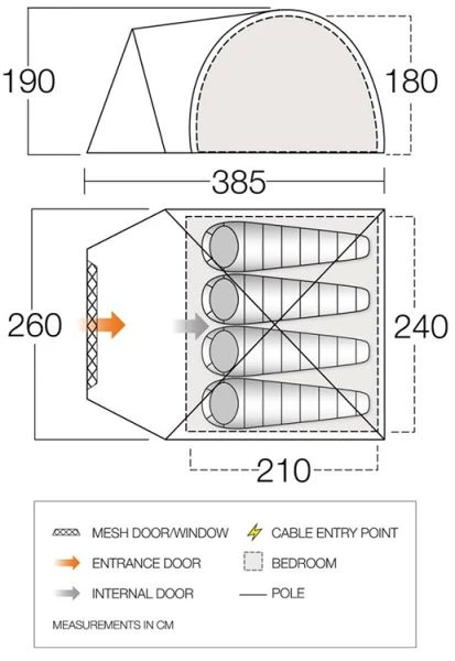 - Linked-In Groundsheet – Easy to clean groundsheet that can be attached or detached from the living area. Simply roll under the bedroom area when not required
