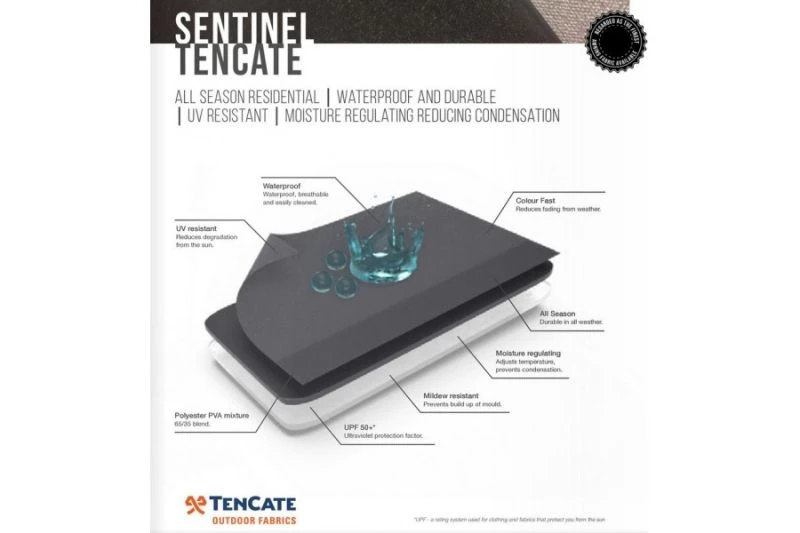 - Sentinel TenCate Residential Fabric – Unique development made from polyester and PVA fibres, with moisture regulating properties to reduce condensation. The microporous acrylic coating makes the fabric waterproof, weather-resistant and durable, ideal for caravan awnings used for extended use or residential pitching.