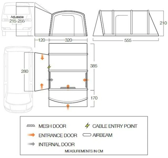 Throughout the awning there are ventilation points low and high. All of the doors that lead into the main body of the awning feature a mesh door. The two side doors also have a drop-down lip to allow you to bring wheel chairs and push chairs in. There are 4 different attachment methods that can be used to connect the awning to your vehicle, whether it’s via a Kador Beading, Throw Over Straps, Velcro tabs for a roof rack or a Sleeve so that a pole can be threaded through and clamped into a gutter. Two tunnel doors allow the use to enter their vehicle without having to go through the awning and other key features included zip up curtains, oversized Airbeams, a sewn-in groundsheet and Vango’s SkyTrack System.