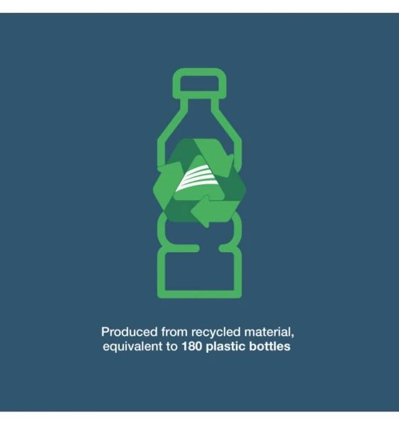 - Produced from recycled material equivalent to 180 plastic bottles