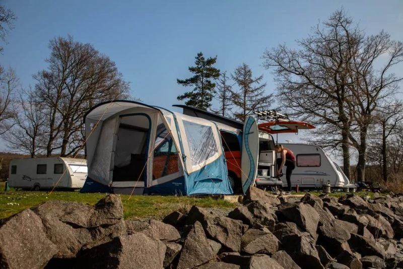 With two doors situated on either side of the connection tunnel, it allows you to enter the van without going through the awning every single time; as well as giving you easy access the tailgate of the vehicle. Zip up curtains give you the flexibility to allow light in or alternatively get privacy when you need it. The Tolga comes in two colours, a Moroccan Blue or a Shadow Grey and has a smaller ‘VW’ attachment height of 180-195cm, alloy front canopy poles allows you to utilise the front door whatever the weather.